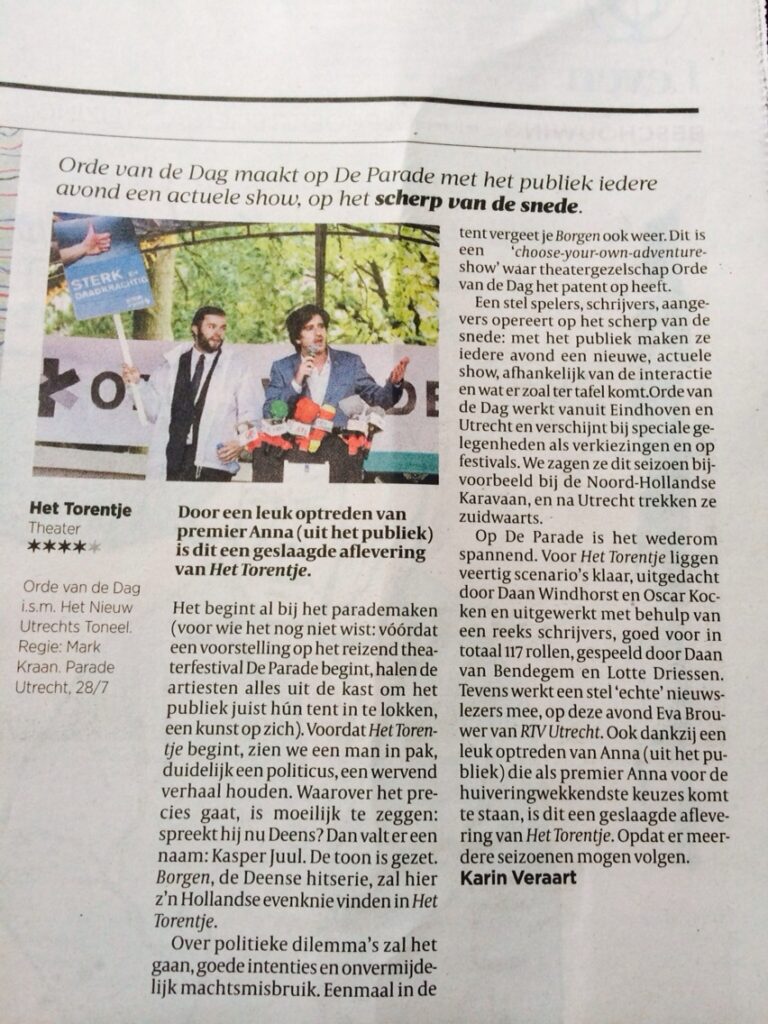 Samen met de sublieme Daan Windhorst bedacht ik in 2015 het concept voor de choose-your-own-adventure-politieke-satire “Het Torentje”. Hierin wordt iemand uit het publiek verkozen tot Minister-President, die vervolgens als de wiedeweerga in de hachelijkste situaties belandt en telkens met veel te weinig informatie en onder hoge druk een beslissing moet nemen. Op basis van die beslissing bladeren de acteurs naar een nieuw hoofdstuk, waar de nieuwe problemen al snel opduiken en de Minister-President opnieuw een belangrijke beslissing moet nemen, waarna het verhaal verder en verder ontspoort.